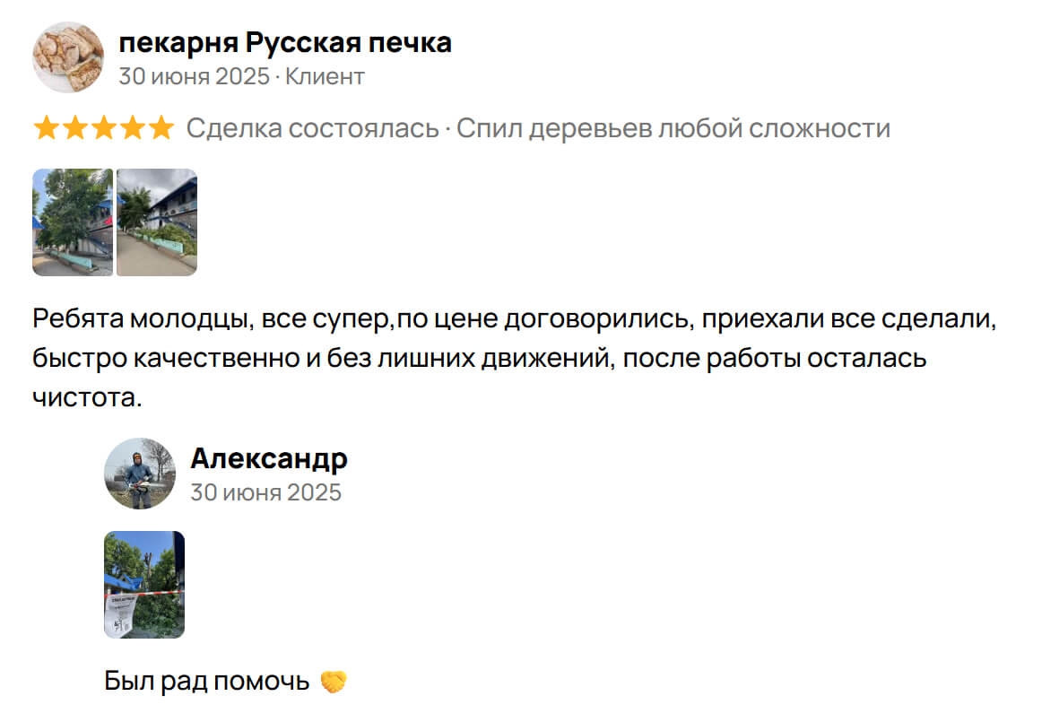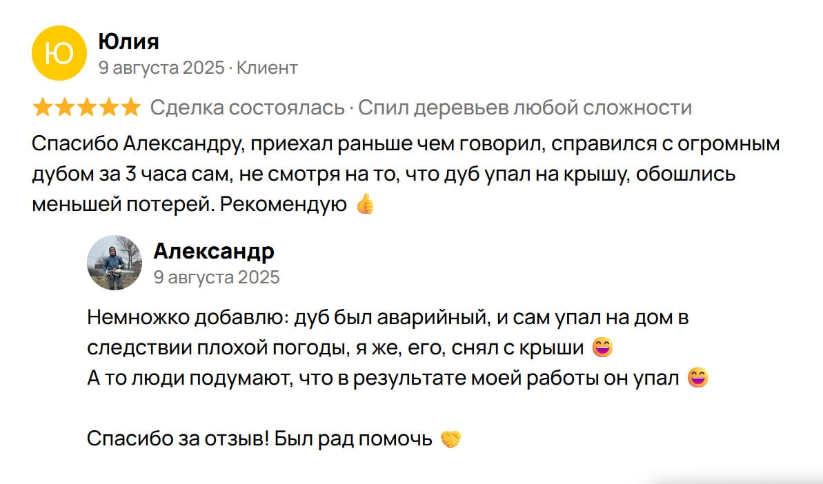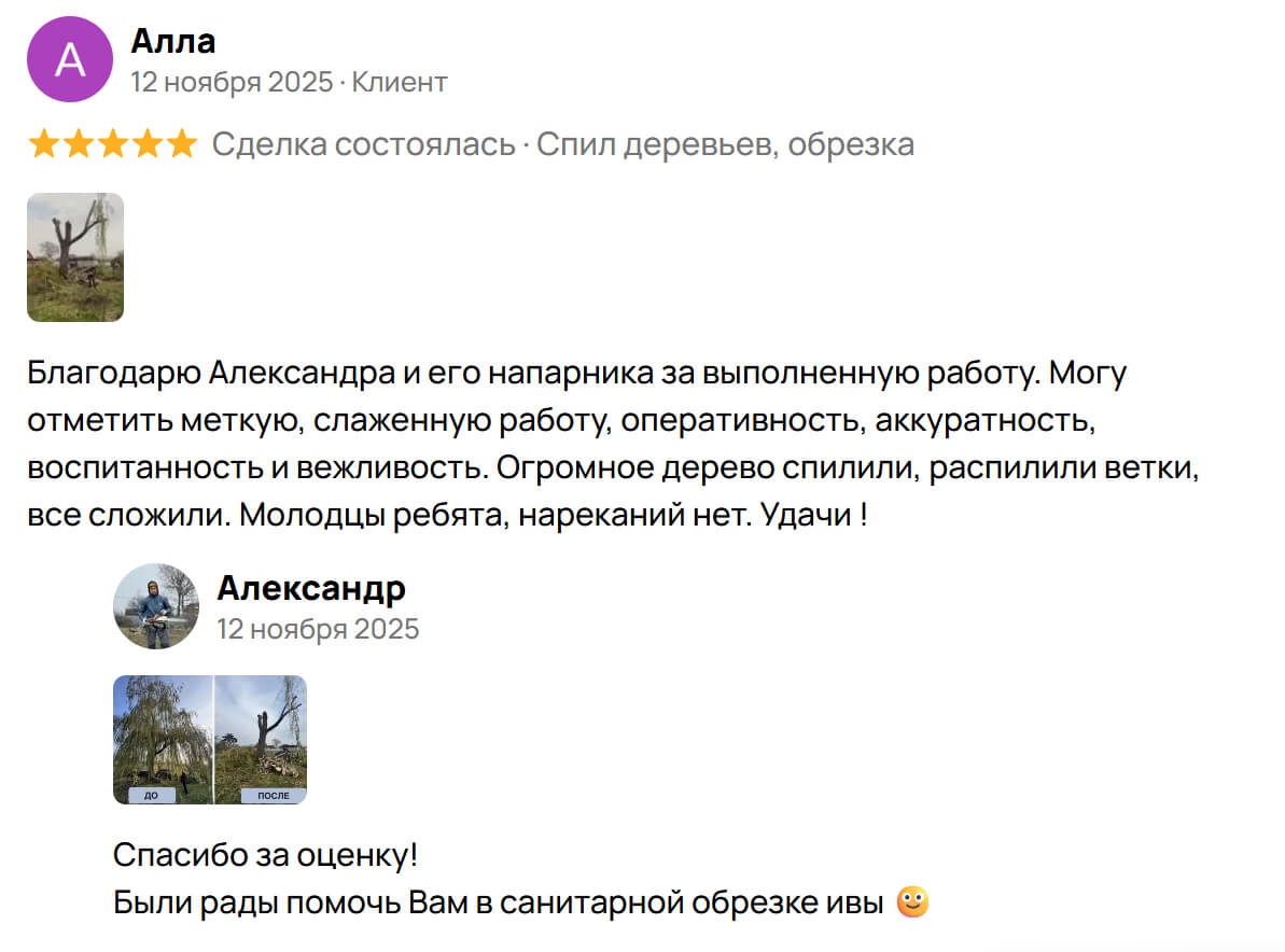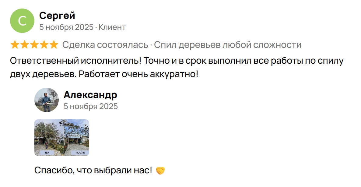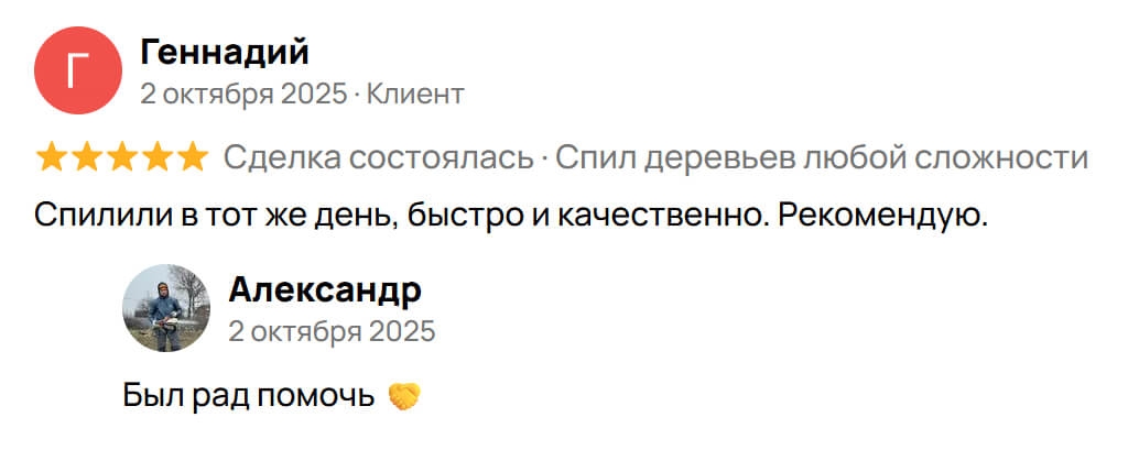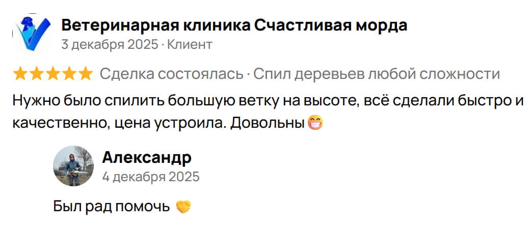 | Спил деревьев | от 7 000 ₽ | Осмотр, организация работ, базовый спил или подготовка к сложным работам. |