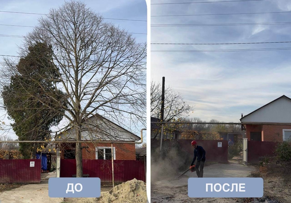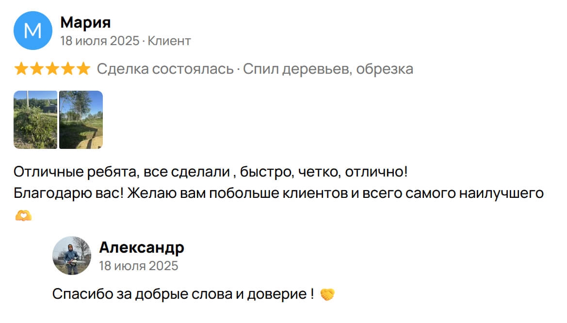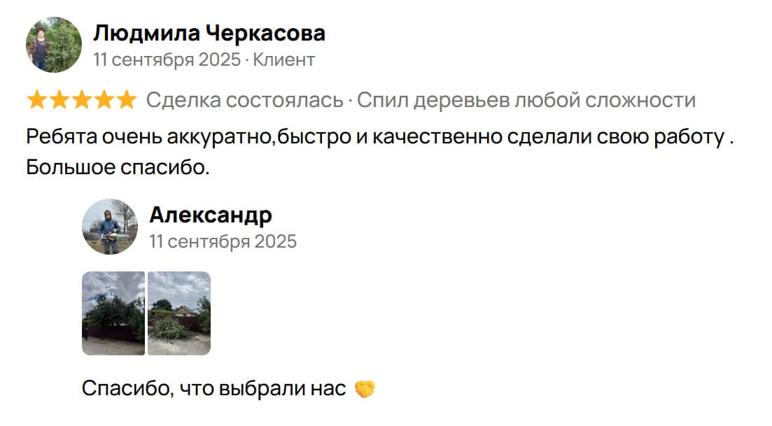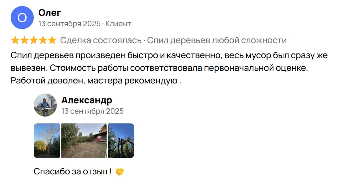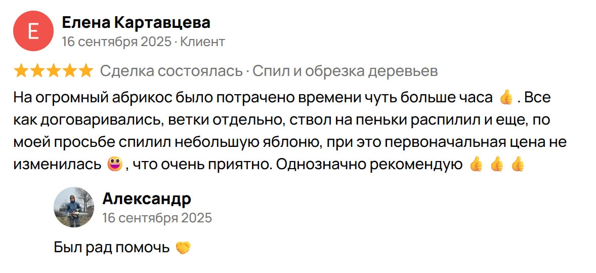 | Спил деревьев | от 7 000 ₽ | Осмотр, организация работ, базовый спил или подготовка к сложным работам. |