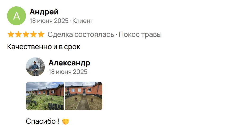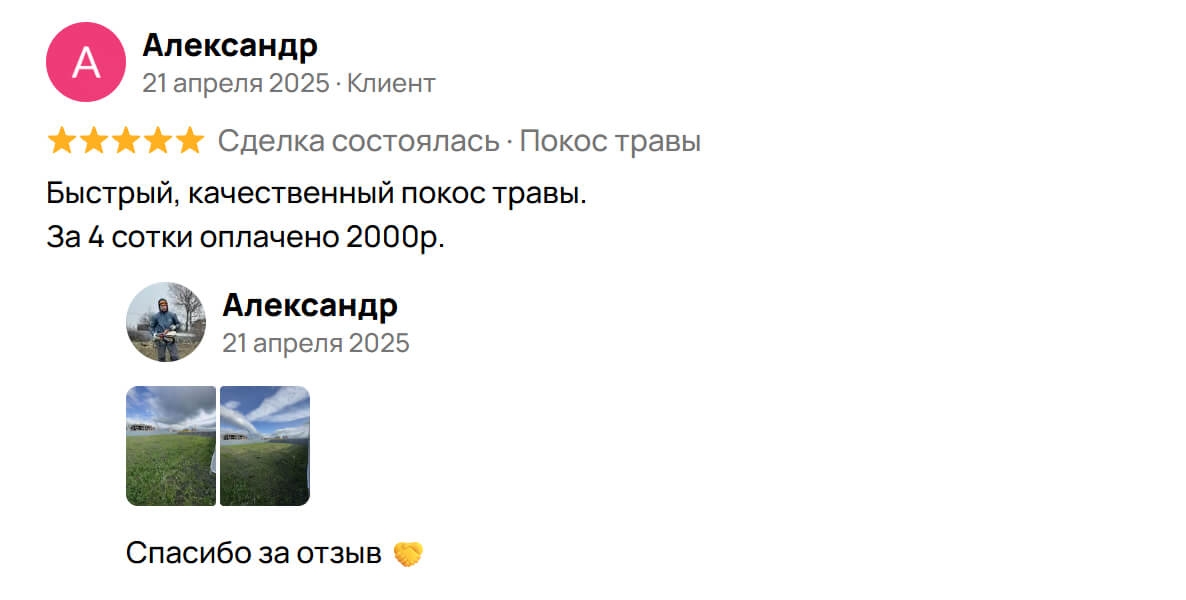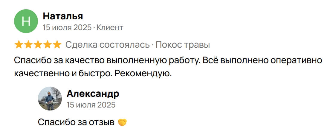 | Покос травы триммером | от 500 ₽ за сотку | Цена зависит от захламлённости участка, его рельефа и высоты травы. Минимальный выезд - 2500 ₽. |